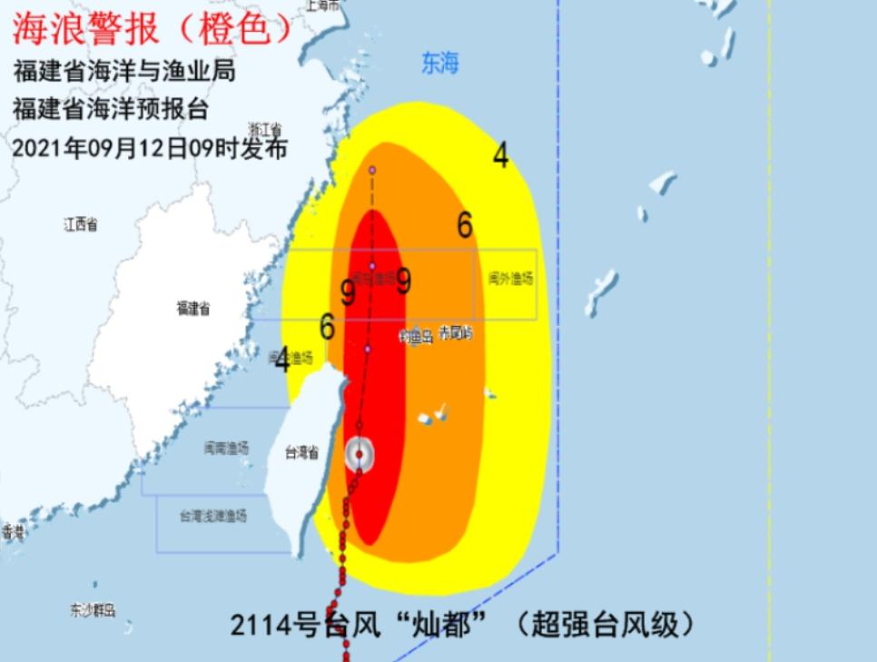 福建省海洋与渔业局海洋预报台今天上午发布海浪橙色预警(Ⅱ级/严重)。受今年第14号台风“灿都”(超强台风级)影响,预计12日上午至13日上午,闽东渔场和钓鱼岛海域将出现6.0~9.0米的狂浪到狂涛,闽外渔场将出现4.5~6.5米的巨浪到狂浪,闽中渔场将出现3.5~5.5米大浪到巨浪。莆田以北沿岸海域将出现1.5~3.3米的中浪到大浪。海浪预警级别为橙色。请海上船只注意防范,做好防风避浪,并密切关注后续警报。