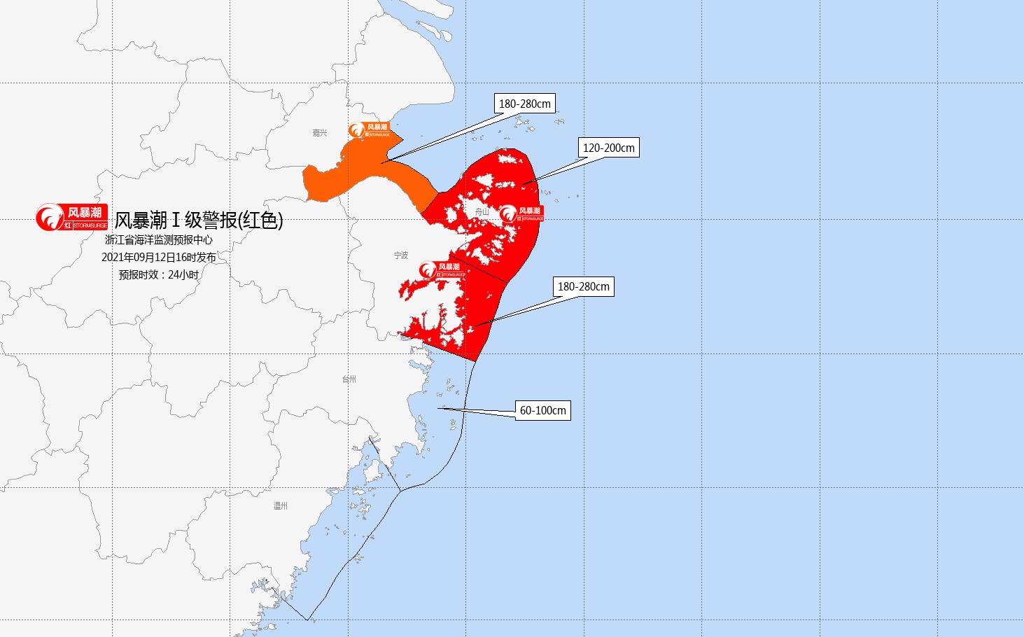 浙江省海洋监测预报中心9月12日16时发布风暴潮Ⅰ级警报:受第14号台风“灿都”(超强台风级)影响,预计今天(12日)夜间到明天白天:嘉兴沿岸将出现180~280厘米的风暴增水,舟山沿岸将出现120~200厘米的风暴增水,宁波沿岸将出现180~280厘米的风暴增水,台州沿岸将出现60~100厘米的风暴增水。镇海、定海、金塘站将出现超过当地红色警戒潮位的高潮位;乍浦、岱山、小衢山、长白、六横、北仑站将出现超过当地橙色警戒潮位的高潮位;澉浦、舟山、湖头渡、乌沙山站将出现超过当地黄色警戒潮位的高潮位;嵊山站将出现超过当地蓝色警戒潮位的高潮位。风暴潮预警级别为红色。(总台记者 李佳)