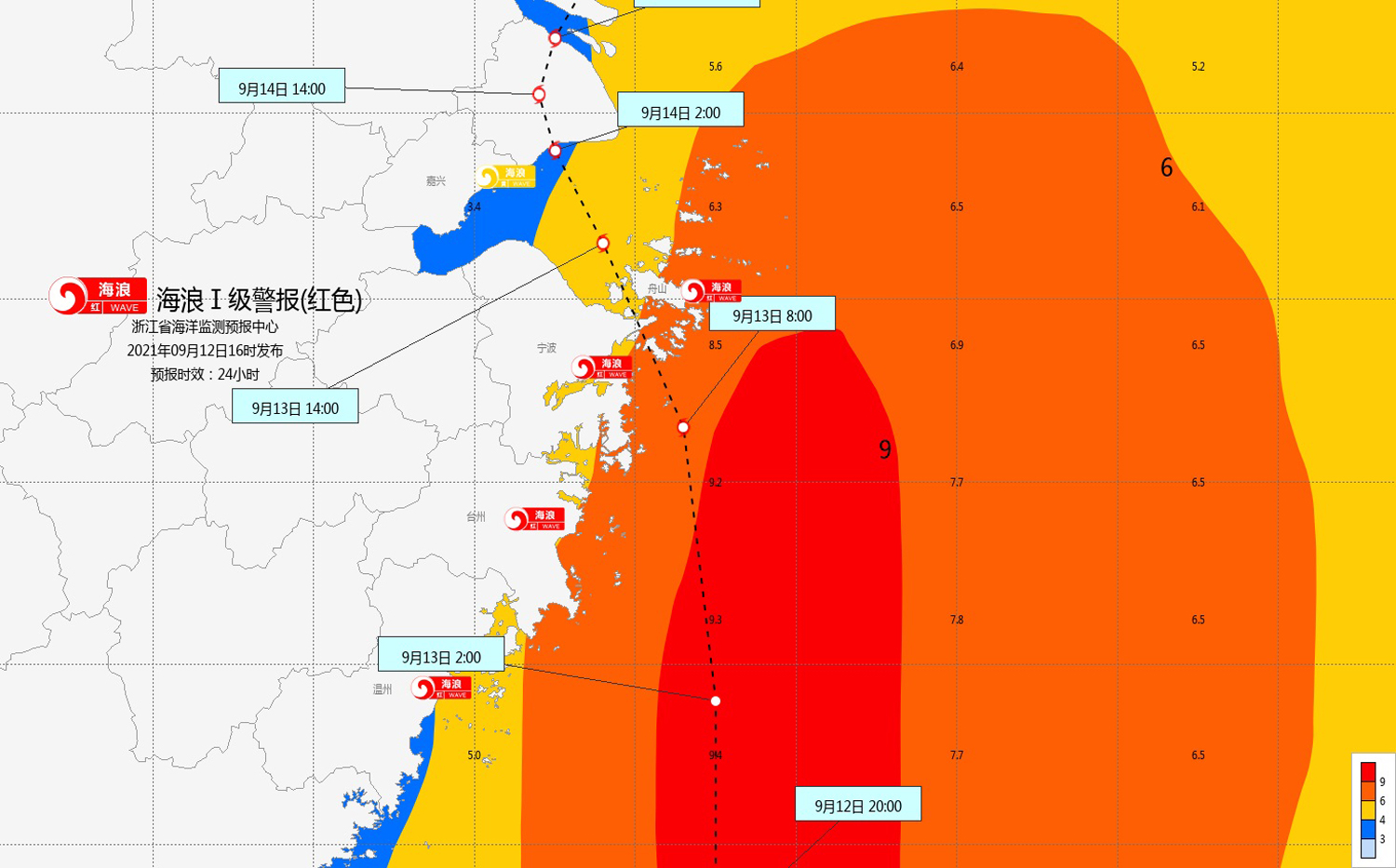浙江省海洋监测预报中心9月12日16时发布海浪Ⅰ级警报。受第14号台风“灿都”(超强台风级)影响,预计今天(12日)夜间到明天白天,近海海域:杭州湾有1.6米到2.5米的中到大浪,明天中午增大到3.5米到4.5米的大到巨浪;浙江北部有4米到6米的巨到狂浪,明天上午增大到8米到10米的狂浪到狂涛;浙江中部有4米到6米的巨到狂浪,明天凌晨增大到8米到10米的狂浪到狂涛;浙江南部有8米到10米的狂浪到狂涛,明天傍晚减小到4米到6米的巨到狂浪;台风中心经过海面将出现10米以上的狂涛。近海海域海浪预警级别为橙色。
