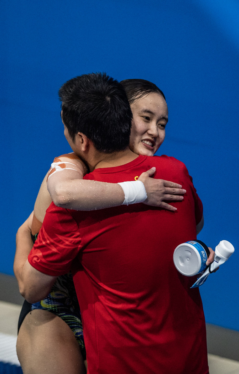 ↑四川队选手任茜在比赛后和教练拥抱庆祝,她以389.25分的总成绩获得季军。新华社记者 陶亮 摄