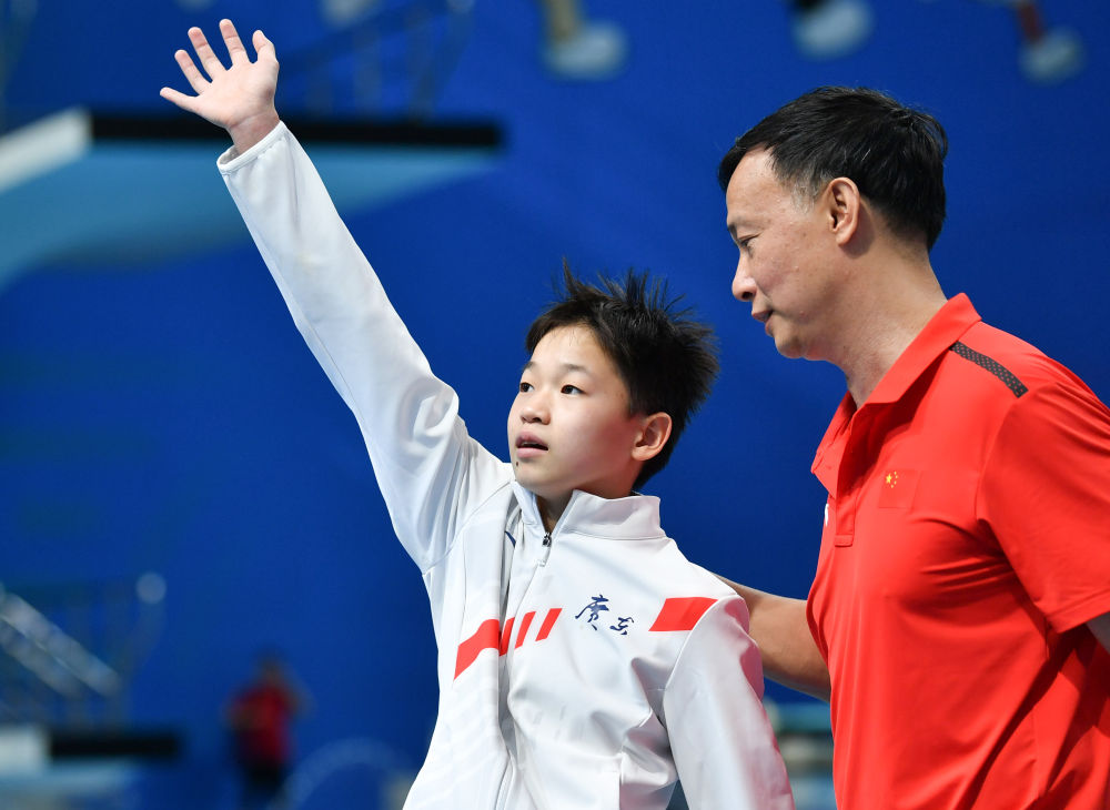 ↑广东队选手全红婵(左)在比赛后向观众招手致意,她以419.25分的总成绩获得冠军。新华社记者 张博文 摄