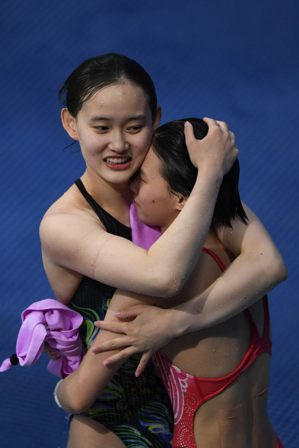 ↑季军四川队选手任茜(左)在比赛后与亚军上海队选手陈芋汐拥抱。新华社记者 薛宇舸 摄