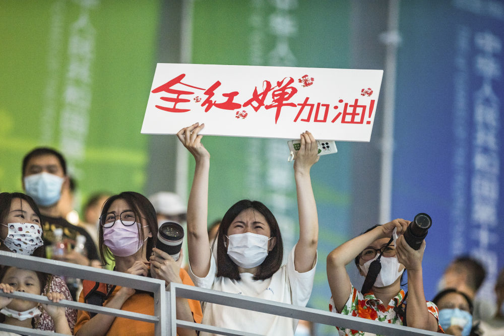 ↑观众为广东队选手全红婵加油。新华社记者 陶亮 摄