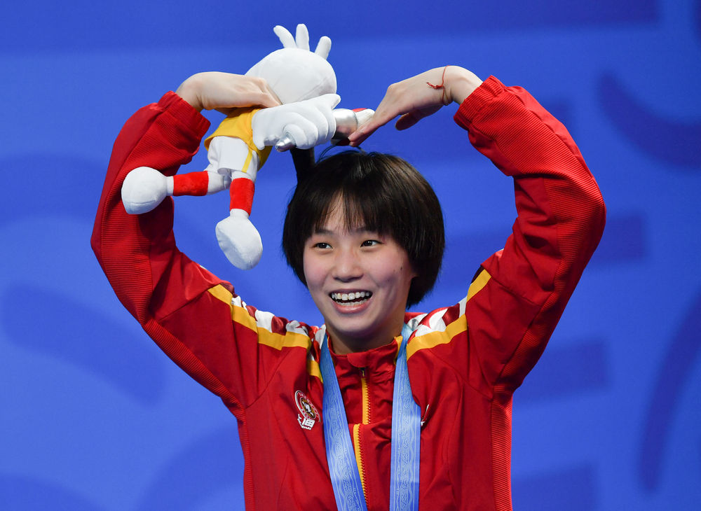 ↑广东队选手全红婵在比赛后向观众比心,她以419.25分的总成绩获得冠军。新华社记者 张博文 摄
