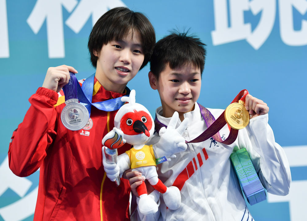 ↑冠军广东队选手全红婵(右)在比赛后与亚军上海队选手陈芋汐合影。新华社记者 张博文 摄