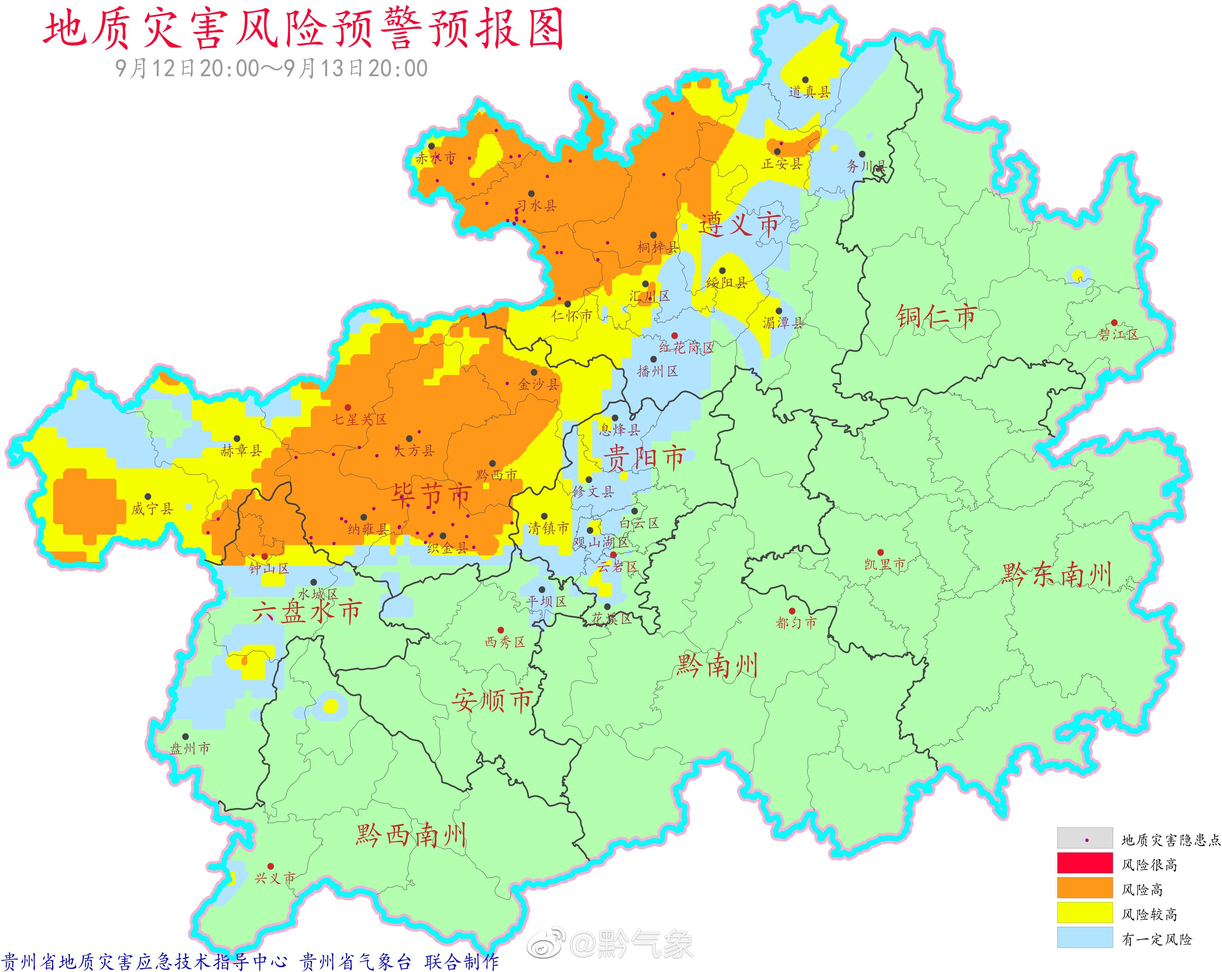 据贵州省气象台12日下午发布的地质灾害气象风险预警预报显示,12日20时至13日20时,贵州省的北部、西部以及东部局地有一定的地质灾害气象风险,其中仁怀、桐梓、赤水、习水、钟山、七星关、大方、金沙、纳雍、黔西、织金等县市区地质灾害气象风险高(橙色预警);清镇、道真、绥阳、播州、汇川、红花岗、正安、水城、赫章、威宁地质灾害气象风险较高(黄色预警),请注意防范!
