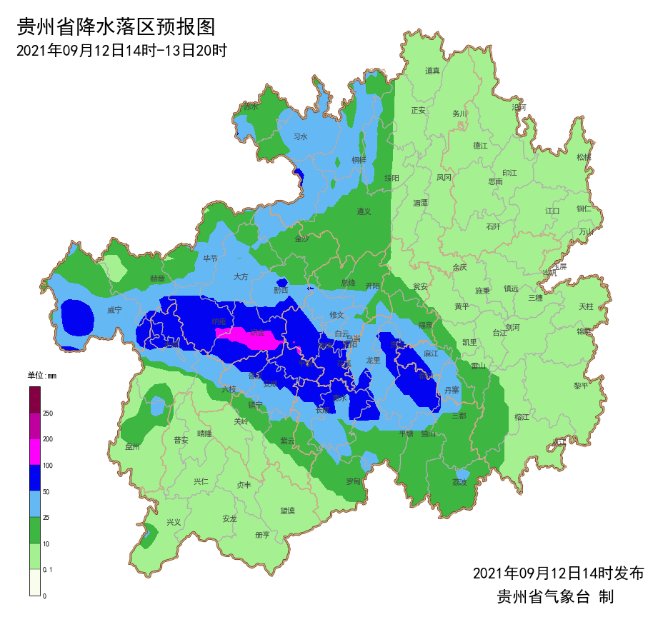 据贵州省气象台最新气象预报显示,9月12日下午至13日白天,贵州省的北部和西部地区阴天间多云有阵雨或雷雨,毕节市大部、遵义市西部、六盘水市北部和东部、贵阳市西部和南部、安顺市北部和东部、黔南州中北部、黔东南州西部局地有中到大雨,部分乡镇有暴雨或大暴雨,其余地区多云有分散阵雨或雷雨。