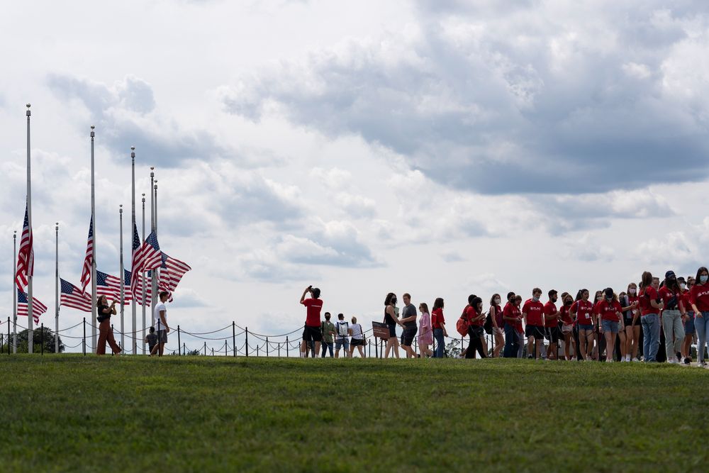 9月11日,美国华盛顿纪念碑周围的美国国旗降半旗,纪念“9·11”恐怖袭击事件二十周年。(新华社记者刘杰摄)