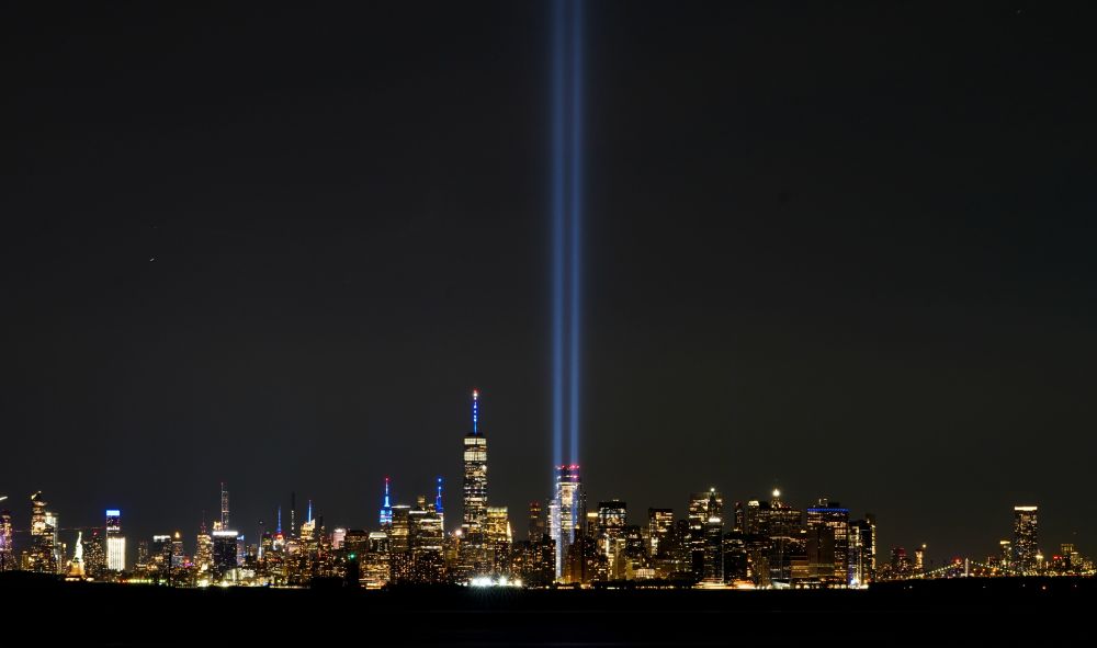 9月11日,美国纽约世贸中心遗址附近亮起象征纽约世贸中心“双子塔”大厦的光柱。(新华社记者王迎摄)