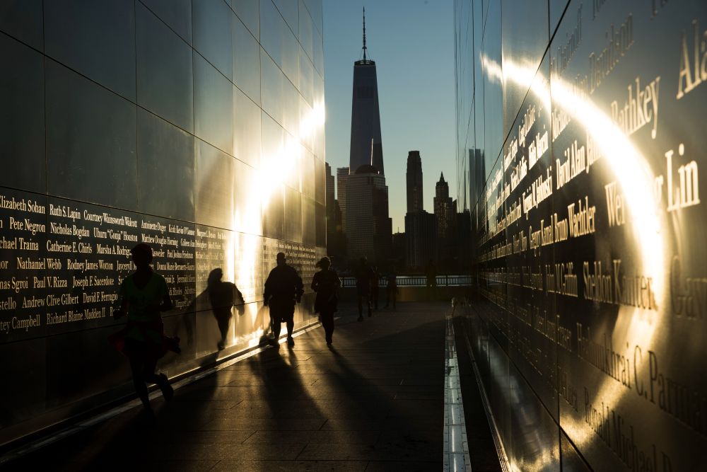 9月11日,在美国新泽西州泽西城的自由州立公园,人们走过“空旷的天空”纪念碑。(新华社记者王迎摄)