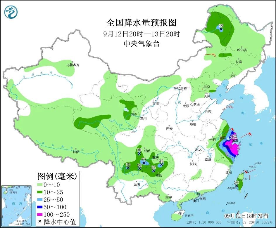 9月12日20时至13日20时,内蒙古东北部、黑龙江西部、青海东北部和西部、江淮东部和南部、江南东部、四川南部、贵州西部和北部、台湾岛大部等地的部分地区有中到大雨,其中,江苏东南部、上海、浙江中北部和东部等地的部分地区有暴雨或大暴雨。