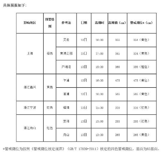 受“灿都”的影响,国家海洋预报台今早继续发布风暴潮红色警报,预计9月13日上午至14日上午,江苏沿海将出现50到120厘米的风暴增水,上海至浙江宁波沿海将出现100到200厘米的风暴增水。上述岸段内的浙江镇海和定海潮位站将于13日下午出现达到当地红色警戒潮位的高潮位,上海芦潮港潮位站将于13日下午出现达到当地橙色警戒潮位的高潮位,上海吴淞、黄浦公园、浙江乍浦、澉浦和舟山潮位站13日下午出现达到当地黄色警戒潮位的高潮位。浙江省宁波市和舟山市的风暴潮预警级别为红色,上海市的风暴潮预警级别为橙色,浙江省嘉兴市和绍兴市的风暴潮预警级别为黄色。