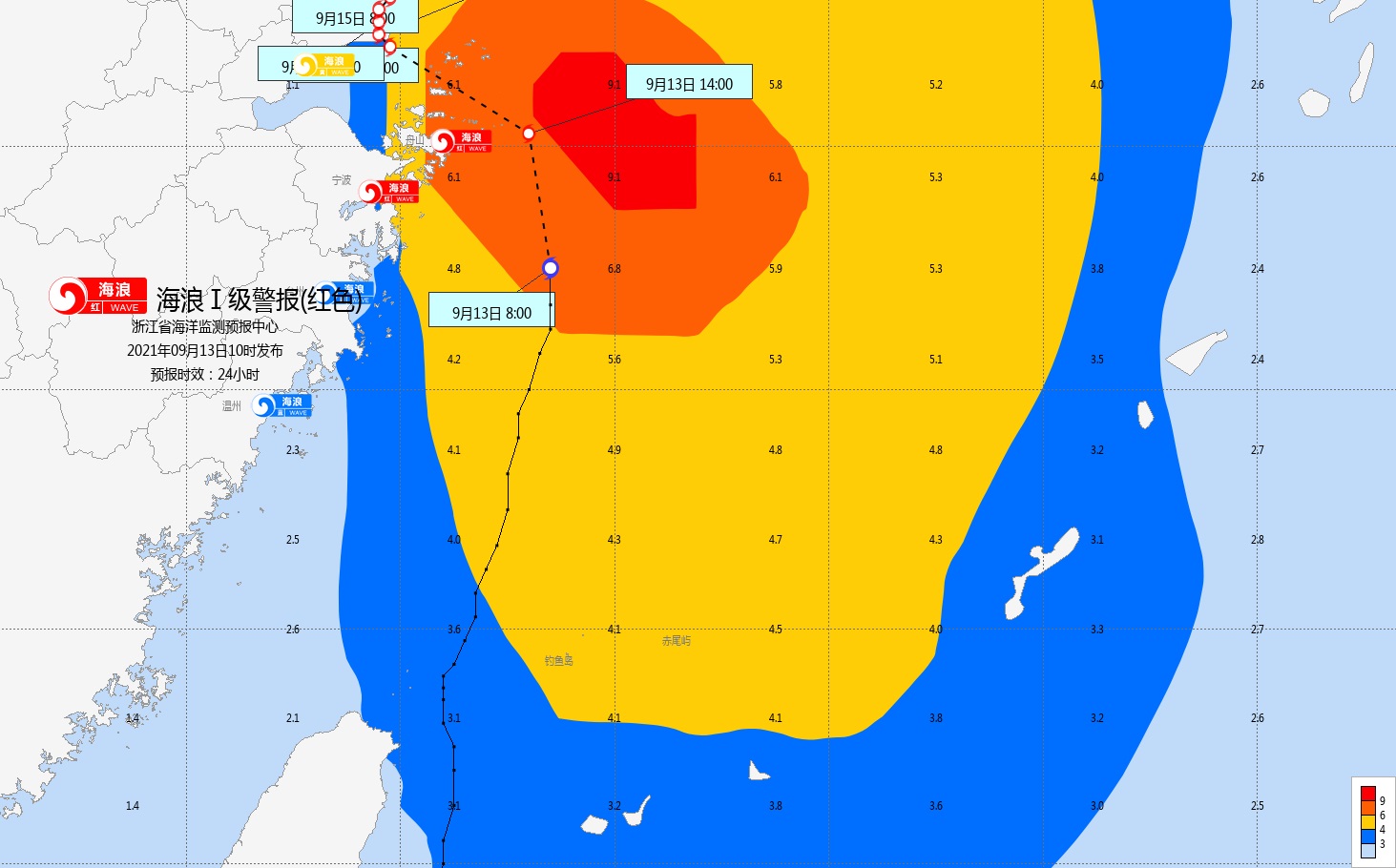 近岸海域:嘉兴有3.0米到4.0米的大到巨浪,明天上午减小到1.6米到2.5米的中到大浪;舟山、宁波有5.0米到7.0米的巨到狂浪,明天上午减小到3.5米到4.5米的大到巨浪;台州有2.2米到3.4米的中到大浪,明天上午减小到1.6米到2.5米的中到大浪;温州有2.0米到3.0米的中到大浪,明天上午减小到1.4米到2.0米的中浪。近岸海域海浪预警级别为红色。