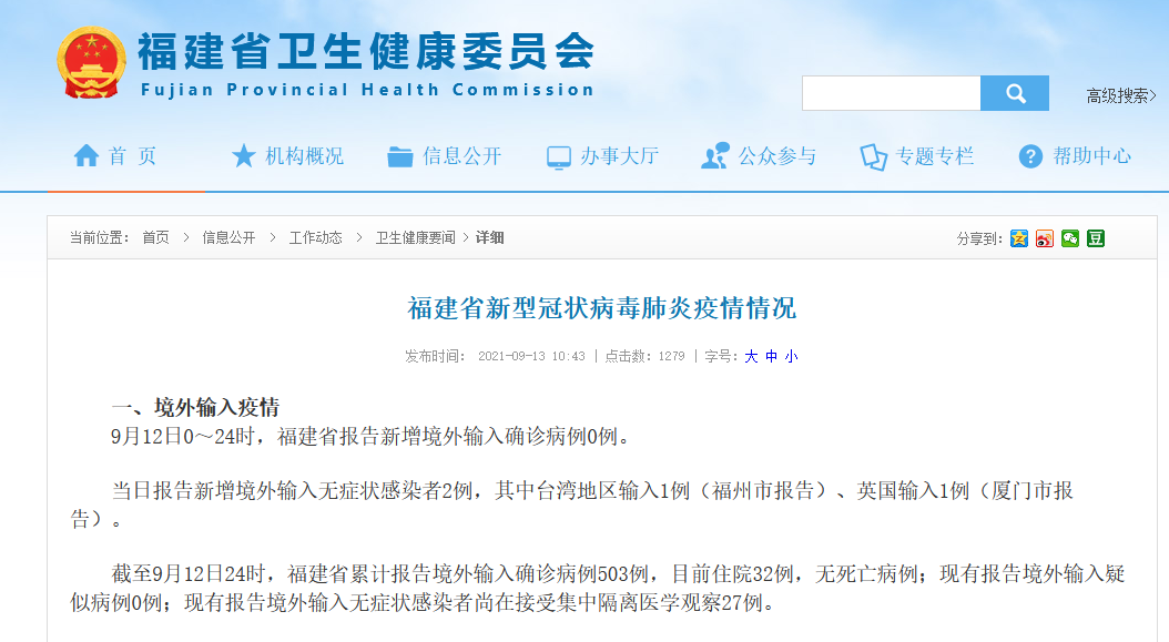 9月12日0~24时,福建省报告新增境外输入确诊病例0例。