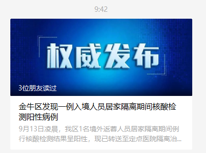 央视网消息:据四川成都市金牛区卫生健康局官方微信消息,9月13日凌晨,该区1名境外返蓉人员居家隔离期间例行核酸检测结果呈阳性,现已转送至定点医院隔离治疗。