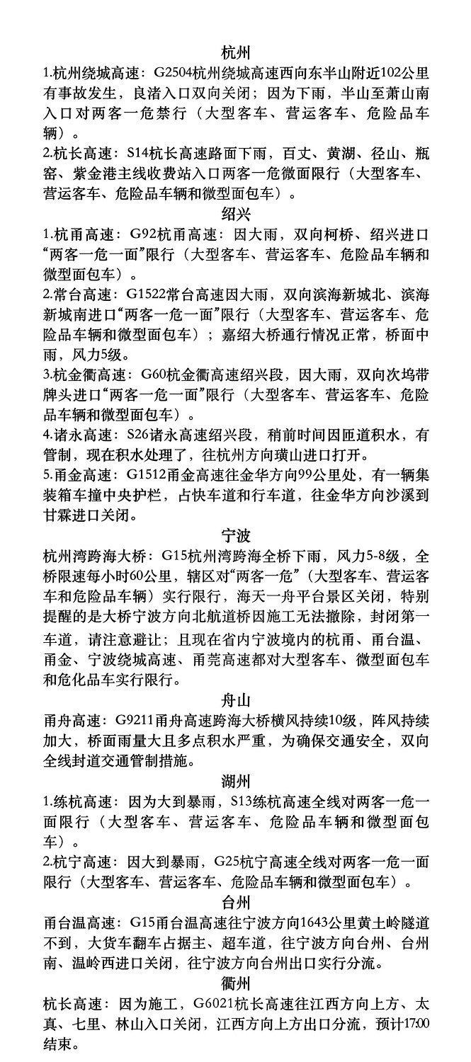 受到台风“灿都”影响,目前浙江全省高速公路通行情况如下。