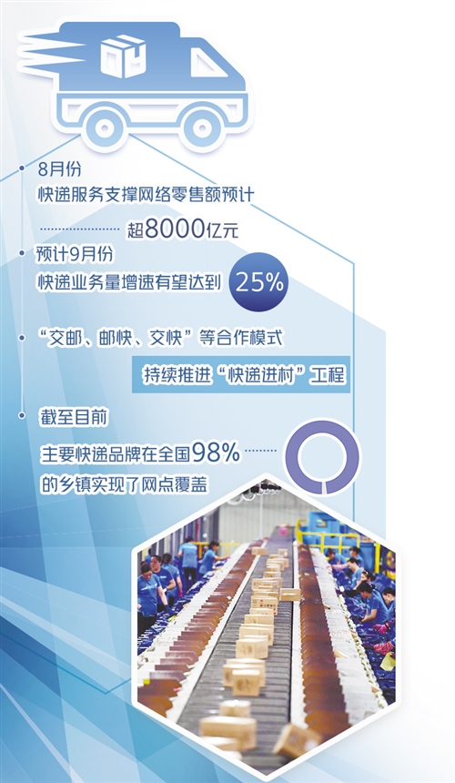如今,随着快递寄递网络不断下沉,极大地促进了工业品下乡、农产品进城的步伐,这种双向流通也有效满足了人们日益增长的消费需要。据统计,8月份,快递服务支撑网络零售额预计超8000亿元,劳动生产率稳步提升。