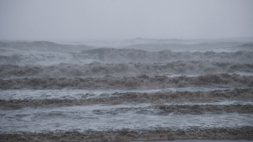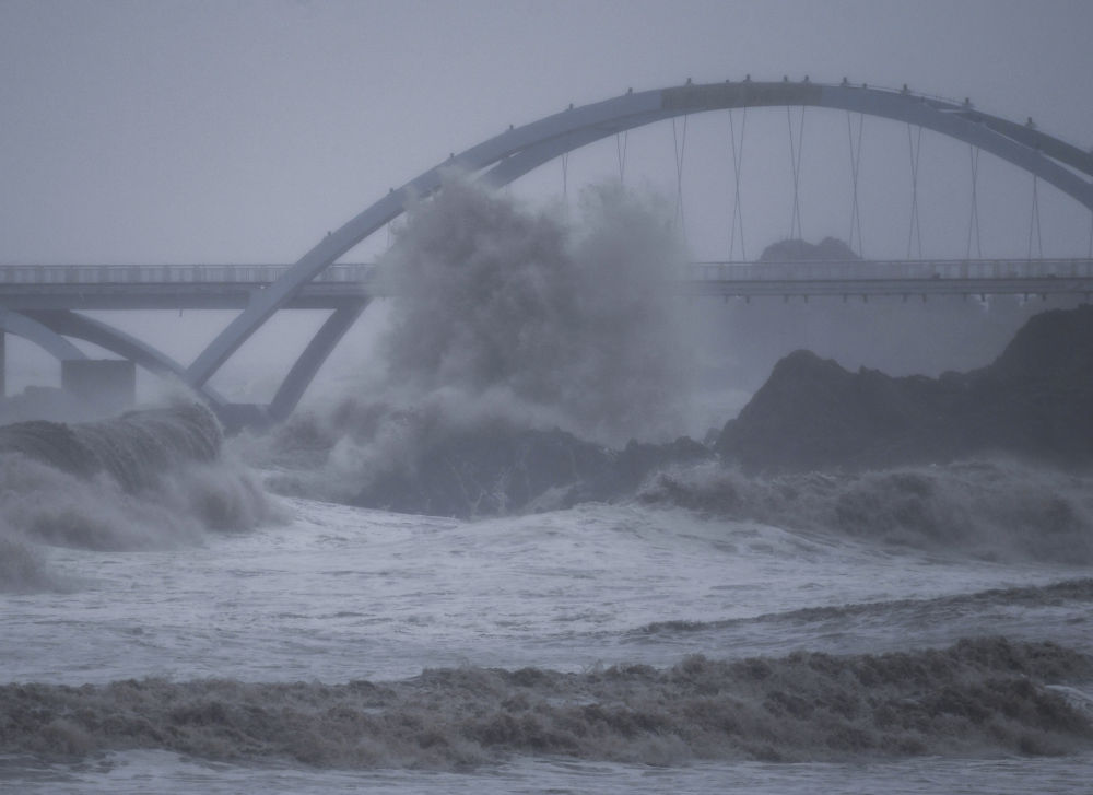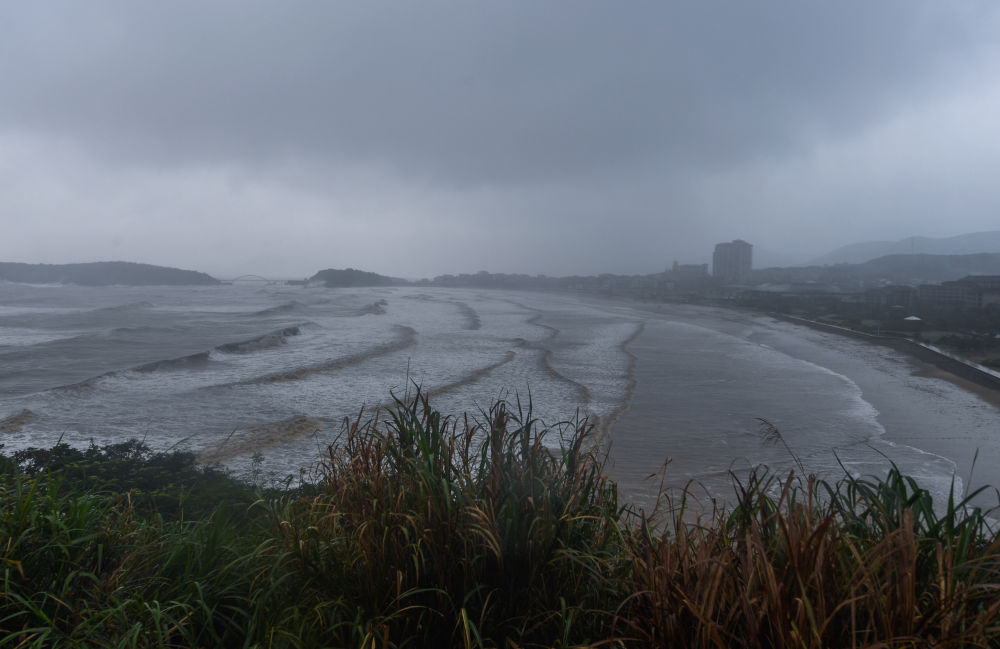 ↑9月13日,浙江舟山朱家尖东沙景区附近的海面上风急浪大。