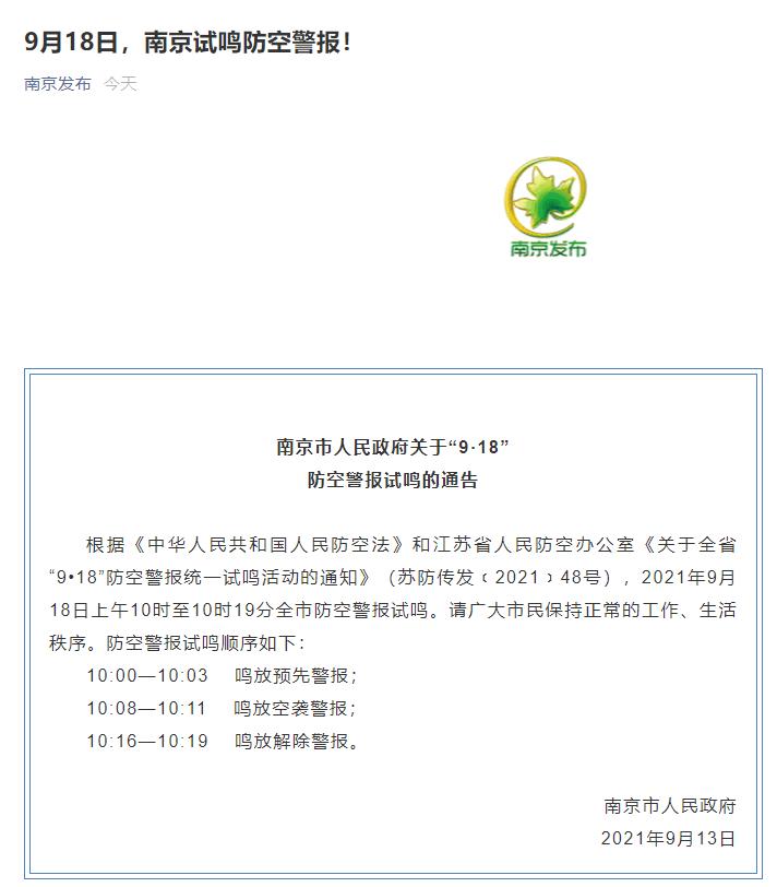据南京发布消息,2021年9月18日上午10时至10时19分,南京全市将试鸣防空警报。通告全文如下: