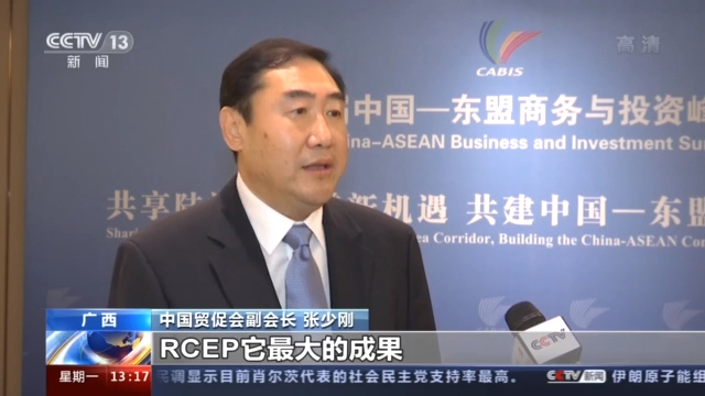 中国贸促会副会长 张少刚:RCEP它最大的成果,是把整个原来亚太地区分散在15个国家的市场或者两两对应的这个国家的市场融合成一个规则统一的、市场统一的这么一个大市场。不仅是会对亚太地区的经济复苏产生作用,而且也会对整个世界的经济发展产生非常积极和有力的推动作用。(总台央视记者 周旋 王雷 善涛 继华 世玉 世军 张军 高淼 王楠 宁宁 理天 广西台)