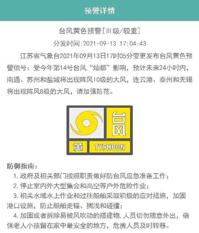 记者从相关部门获悉,江苏省气象台2021年09月13日17时05分变更发布台风黄色预警信号:受今年第14号台风“灿都”影响,预计未来24小时内,南通、苏州和盐城将出现阵风10级的大风,连云港、泰州和无锡将出现阵风8级的大风,请加强防范。