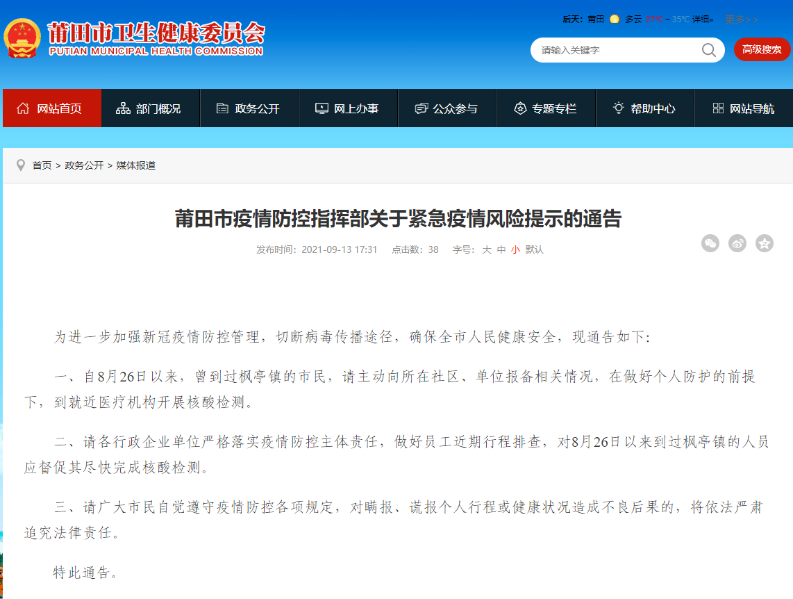 据莆田市卫健委网站13日公开消息,为进一步加强新冠疫情防控管理,切断病毒传播途径,确保全市人民健康安全,现通告如下: