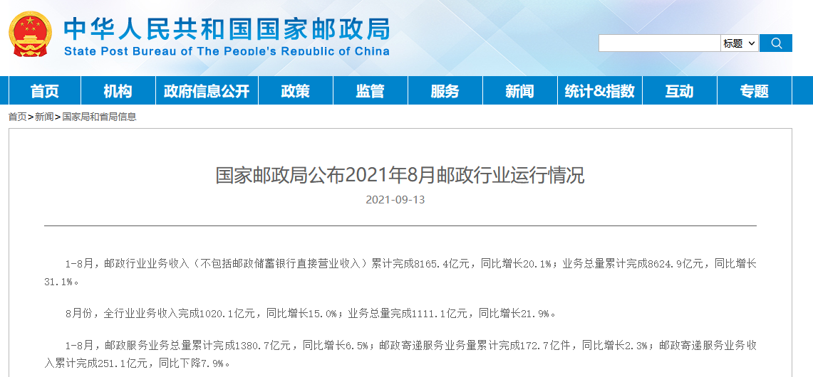 央视网消息:据国家邮政局网站消息,国家邮政局13日公布2021年8月邮政行业运行情况。