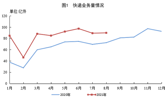 8月份,全国快递服务企业业务量完成89.9亿件,同比增长24.3%;业务收入完成840.1亿元,同比增长15.5%。