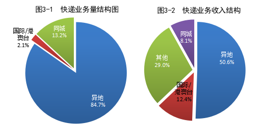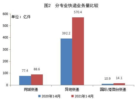 1-8月,同城、异地、国际/港澳台快递业务量分别占全部快递业务量的13.2%、84.7%和2.1%;业务收入分别占全部快递收入的8.1%、50.6%和12.4%。与去年同期相比,同城快递业务量的比重下降2.9个百分点,异地快递业务量的比重上升3.1个百分点,国际/港澳台业务量的比重下降0.2个百分点。