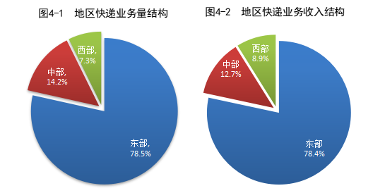 1-8月,东、中、西部地区快递业务量比重分别为78.5%、14.2%和7.3%,业务收入比重分别为78.4%、12.7%和8.9%。与去年同期相比,东部地区快递业务量比重下降1.4个百分点,快递业务收入比重下降1.5个百分点;中部地区快递业务量比重上升1.4个百分点,快递业务收入比重上升1.1个百分点;西部地区快递业务量比重基本持平,快递业务收入比重上升0.4个百分点。