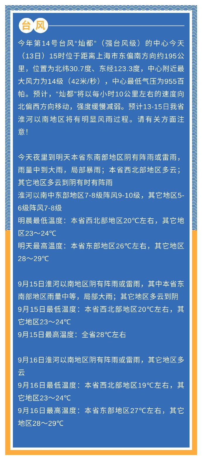受第14号台风“灿都”影响,今天(13日)夜里到明天,江苏省东南部地区阴有阵雨或雷雨,雨量中到大雨,局部暴雨;江苏省西北部地区多云;其他地区多云到阴有时有阵雨。