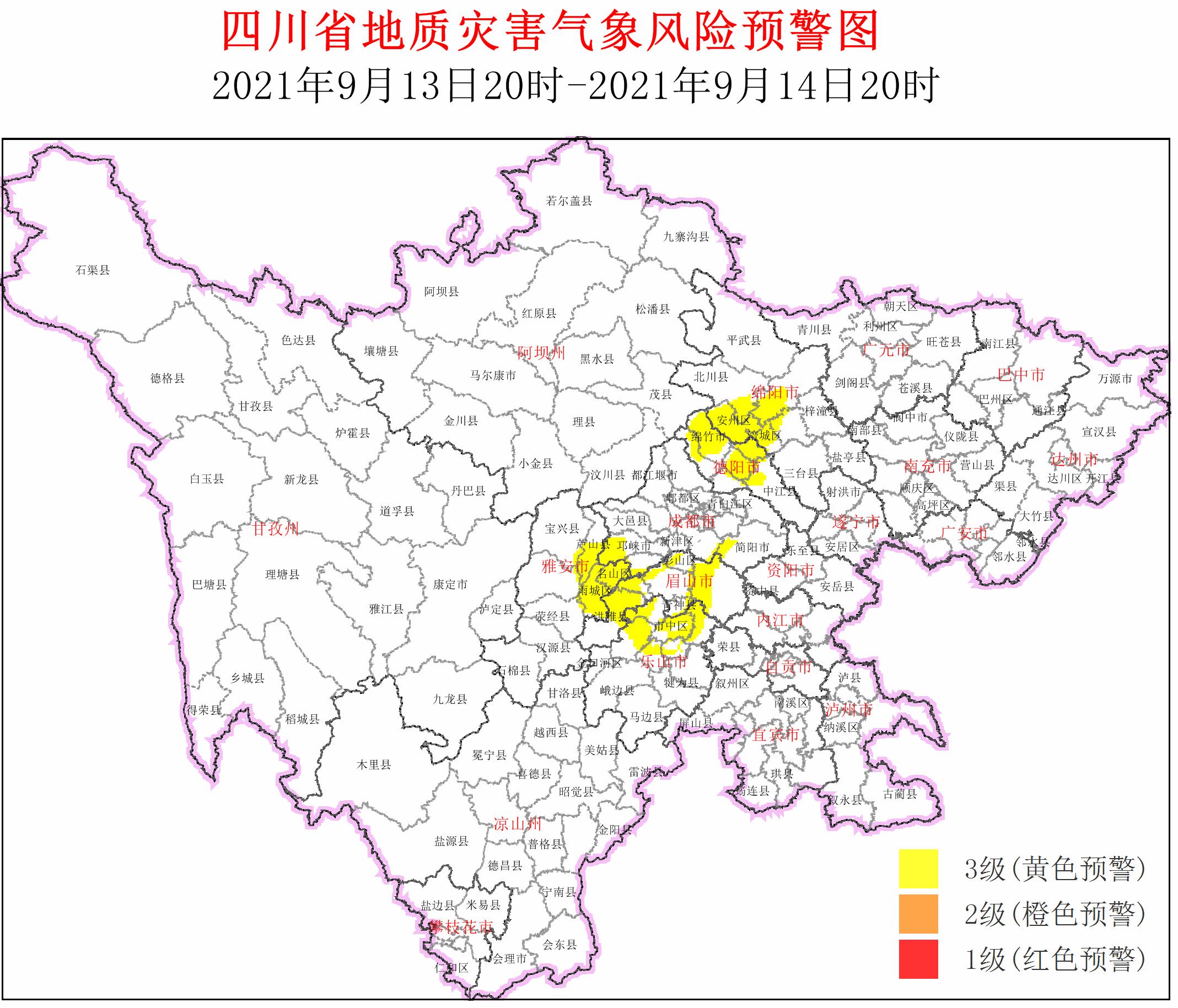 四川省地质灾害指挥部办公室今天17时发布消息,9月13日20时—9月14日20时,地质灾害气象风险3级黄色预警区域为绵阳安州区、涪城区、游仙区、江油市、北川县,德阳旌阳区、罗江区、广汉市、什邡市、绵竹市、中江县,成都双流区、邛崃市、简阳市、蒲江县,雅安名山区、雨城区、荥经县、天全县、芦山县、宝兴县,眉山东坡区、彭山区、青神县、仁寿县、洪雅县、丹棱县,乐山市中区、五通桥区、沙湾区、峨眉山市、井研县、夹江县等6市33个县(市、区)。