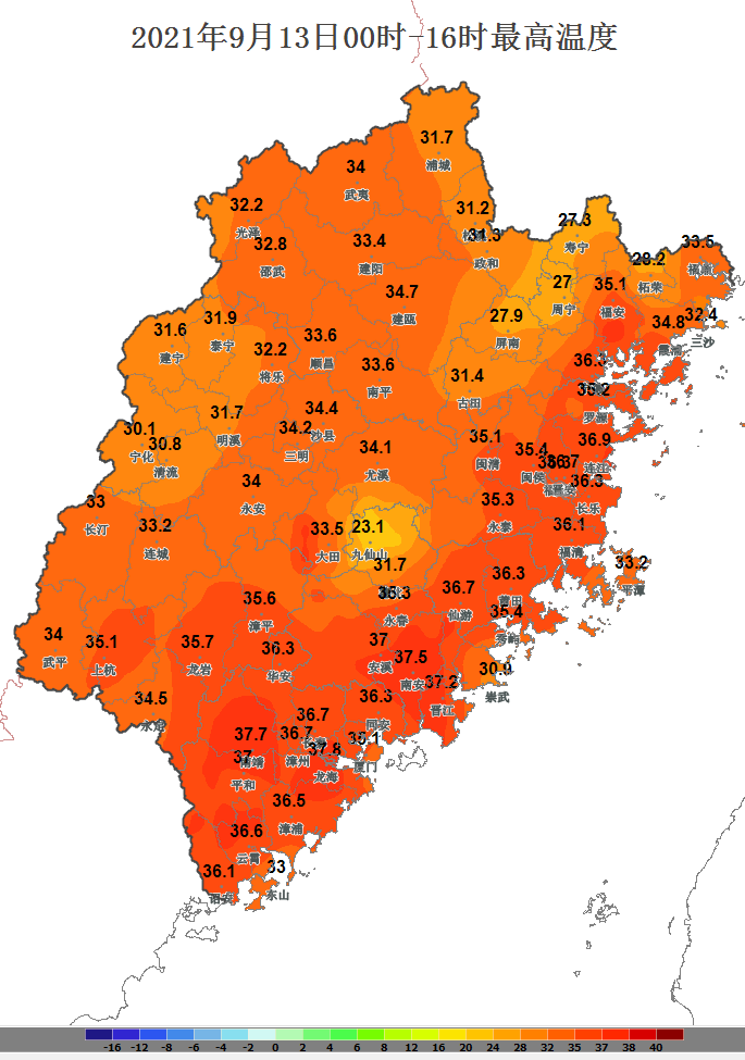 福建省气象台13日17时发布高温预报:14日福州中西部、莆田西部、泉州中南部、厦门北部、漳州中北部和龙岩东部的部分城区最高气温可达36~37℃,局部38℃。