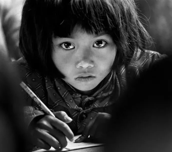 黑白色调的照片里,小姑娘衣着破旧,头发蓬乱,小手握着铅笔坐在桌前,表情怯生生的,一双清亮纯真的大眼睛似乎在凝视着你,流露出强烈的、渴望的光芒,正代表着无数贫困地区的孩子在发出心底的呐喊:“我要上学!”