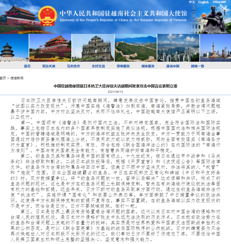 日本防卫大臣岸信夫日前访问越南期间,肆意发表攻击中国言论,并就台湾问题粗暴干涉中国内政,中方对此坚决反对。9月13日,中国驻越南大使馆严正阐明以下立场,以正视听。