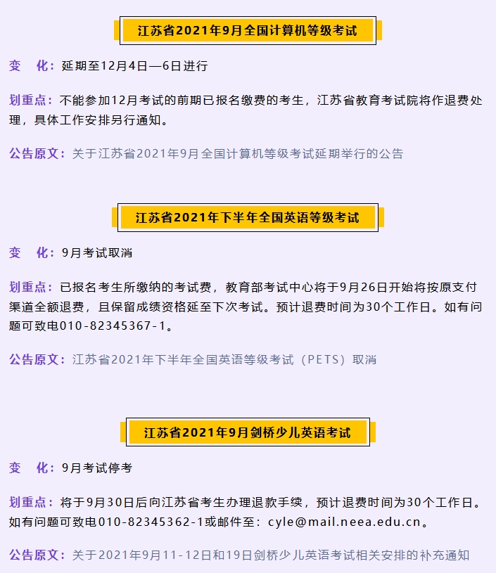 2、江苏省2021年下半年全国英语等级考试(PETS)取消。已报名考生所缴纳的考试费,教育部考试中心将于9月26日开始将按原支付渠道全额退费,且保留成绩资格延至下次考试。预计退费时间为30个工作日。