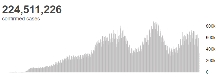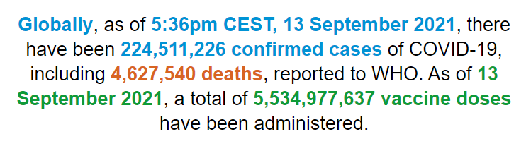 根据世卫组织最新实时统计数据,截至欧洲中部夏令时间9月13日17时36分(北京时间9月13日23时36分),全球累计新冠肺炎确诊病例224511226例,累计死亡病例4627540例。13日全球新冠肺炎确诊病例新增330815例,死亡病例新增6335例。(总台记者 朱赫)