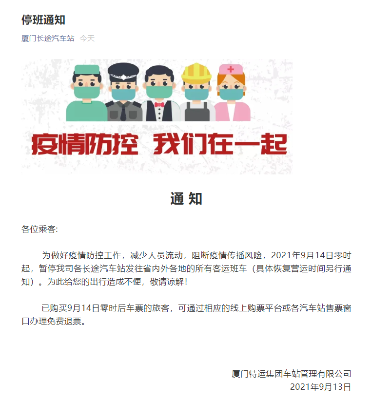 据微信公众号“厦门长途汽车站”消息,2021年9月14日零时起,厦门暂停各长途汽车站发往省内外各地的所有客运班车,具体通知如下: