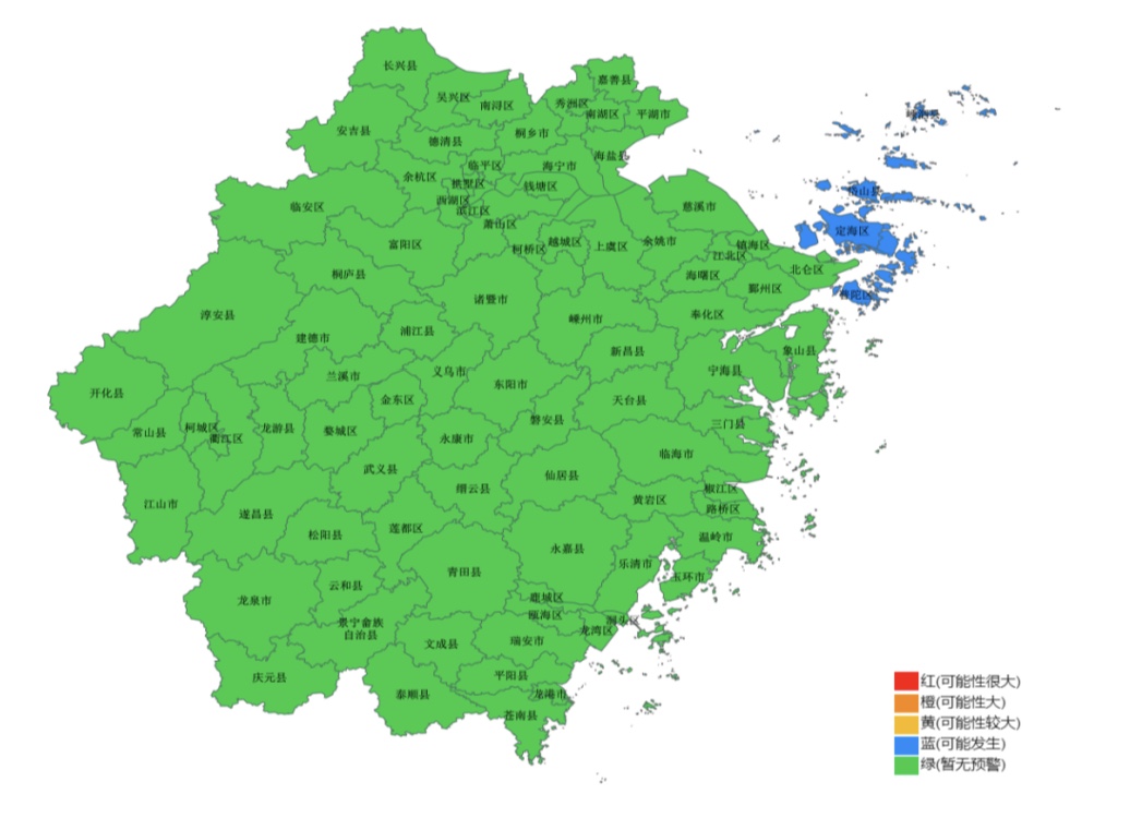 浙江省水利厅9月14日7时发布山洪灾害预警:根据省气象台未来降雨预报,预计9月14日8时至9月15日8时,定海区、普陀区、岱山县、嵊泗县可能发生山洪灾害(蓝色预警)。