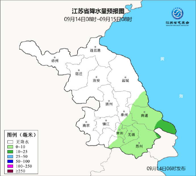9月15日江苏省东南部地区阴有阵雨或雷雨,雨量小到中等,局部大;其他地区多云。