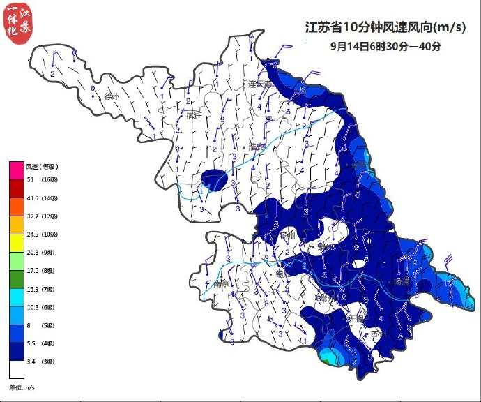 目前,江苏省各地没有明显降水,但是今天受台风外围影响,风力强劲,尤其是淮河以南中东部地区,将有7级的偏北大风,阵风在8~9级。