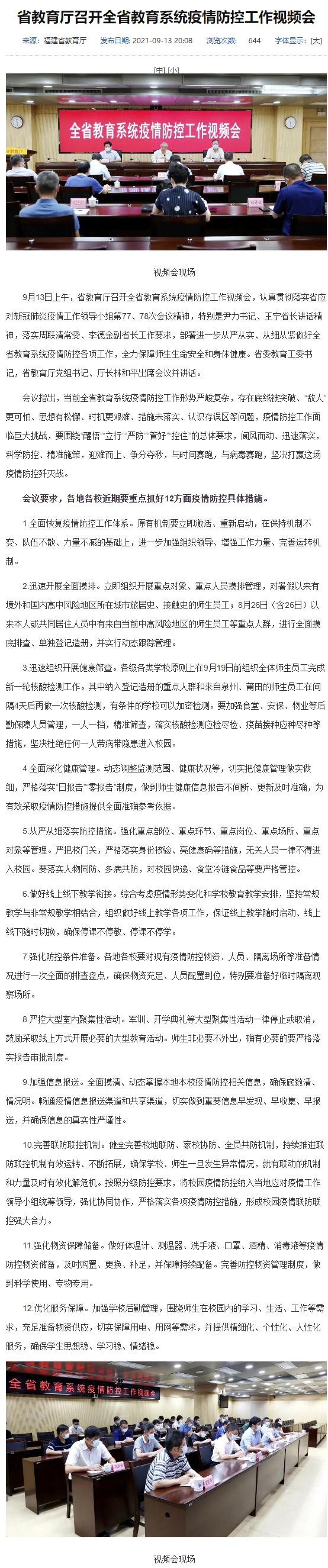 福建省教育厅13日召开全省教育系统疫情防控工作视频会,要求各地保证线上教学随时启动、线上线下随时切换,各地各校近期要重点抓好12方面疫情防控具体措施,其中包括严控大型室内聚集性活动,军训、开学典礼等大型聚集性活动一律停止或取消,鼓励采取线上方式开展必要的大型教育活动。具体内容如下: