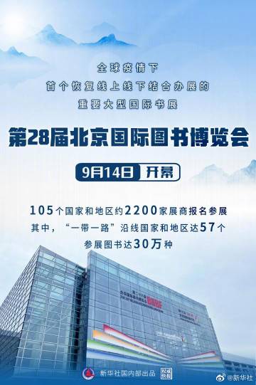 【#权威快报#|30万种精品图书亮相!#第28届北京国际图书博览会#开幕】9月14日,第28届北京国际图书博览会在中国国际展览中心(北京顺义新馆)开幕,成为全球疫情下首个恢复线上线下结合办展的重要大型国际书展。105个国家和地区约2200家展商报名参展,其中,“一带一路”沿线国家和地区达57个。本届图博会由国家新闻出版署、科学技术部、北京市人民政府、中国出版协会、中国作家协会主办,中国图书进出口(集团)有限公司承办,巴基斯坦担任主宾国;将采取线下展会为主、网上平台配套、线上线下结合的方式举办,打造一场集版权贸易、出版展示、文化交流、专业研讨和阅读推广等功能为一体的大型国际文化交流盛宴。(记者史竞男、潘洁,海报设计贾伊宁)