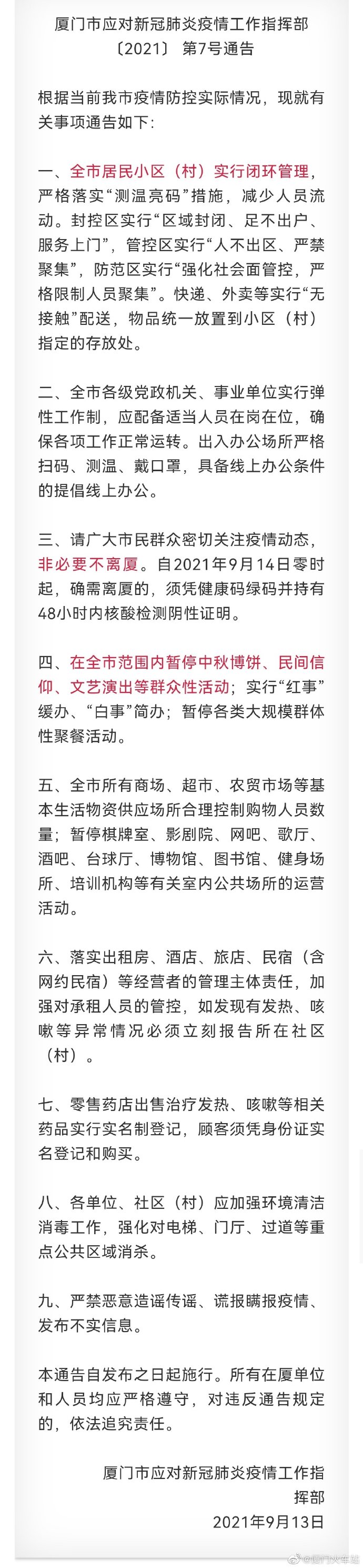 央视网消息:据“厦门火车站”微博消息,自2021年9月14日零时起,确需离厦的,须凭健康码绿码并持有48小时内核酸检测阴性证明。