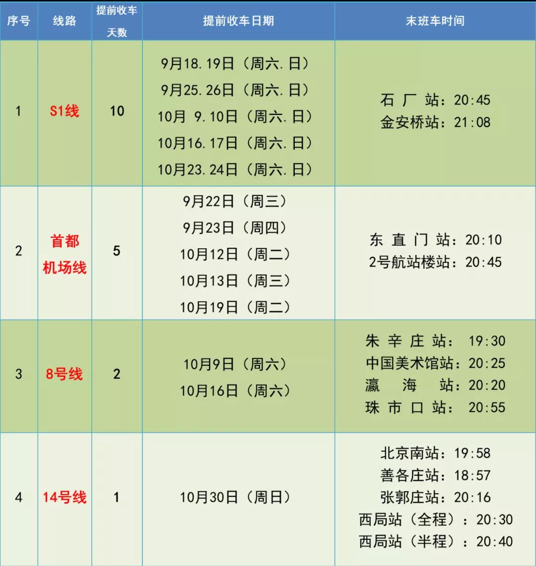 S1线:计划于9月18日(周六)、9月19日(周日)、9月25日(周六)、9月26日(周日)、10月9日(周六)、10月10日(周日)、10月16日(周六)、10月17日(周日)、10月23日(周六)、10月24日(周日),共计10次提前收车。S1线石厂站末班车提前至20:45,金安桥站末班车提前至21:08。