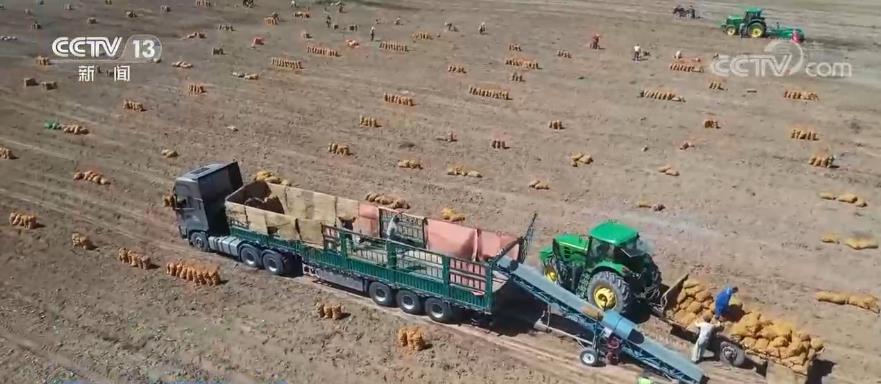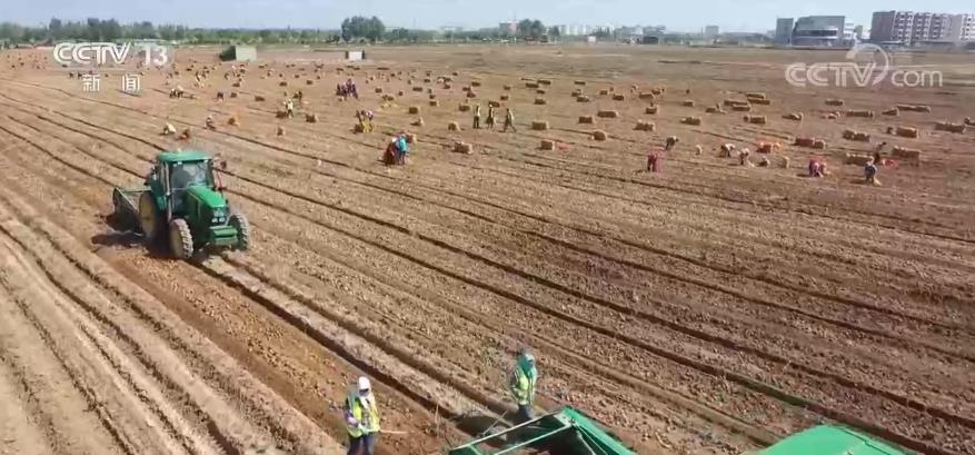 在甘肃兰州,当地的马铃薯也迎来收获季。在兰州新区中川园区的这片马铃薯规模化种植基地里,收薯机来回穿梭,村民们忙着采收,一袋袋马铃薯经过分拣、挑选、装袋后将销往市场。