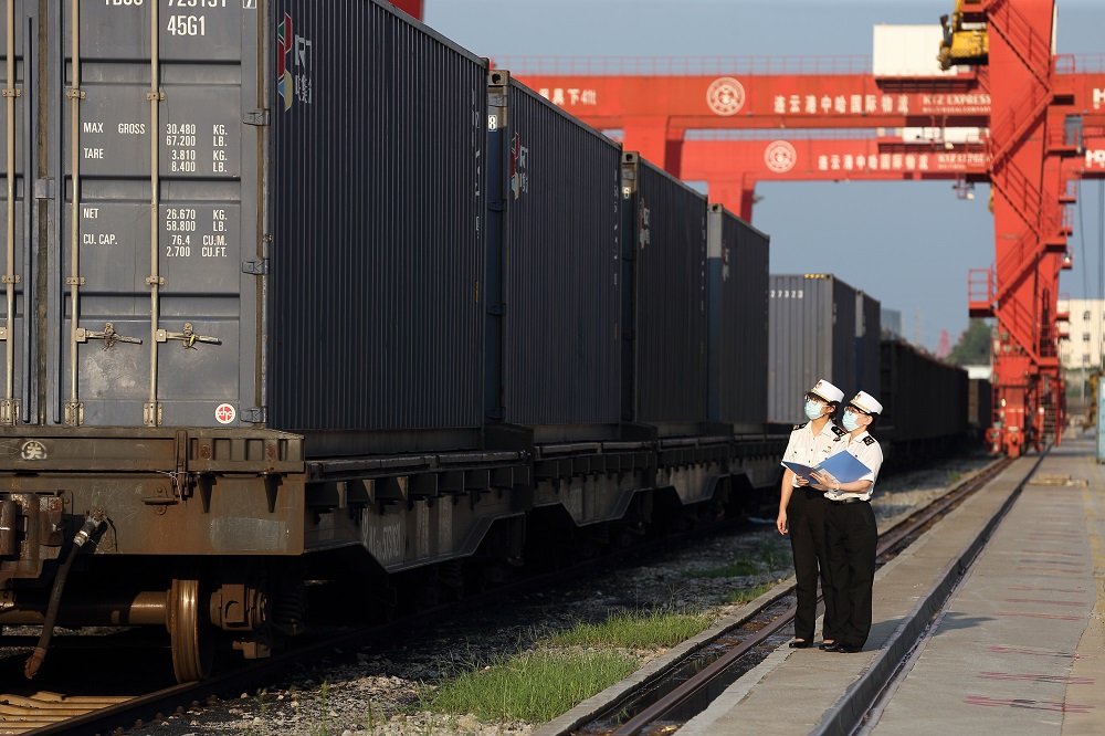 △图为连云港海关关员正在对中欧班列进行现场查验