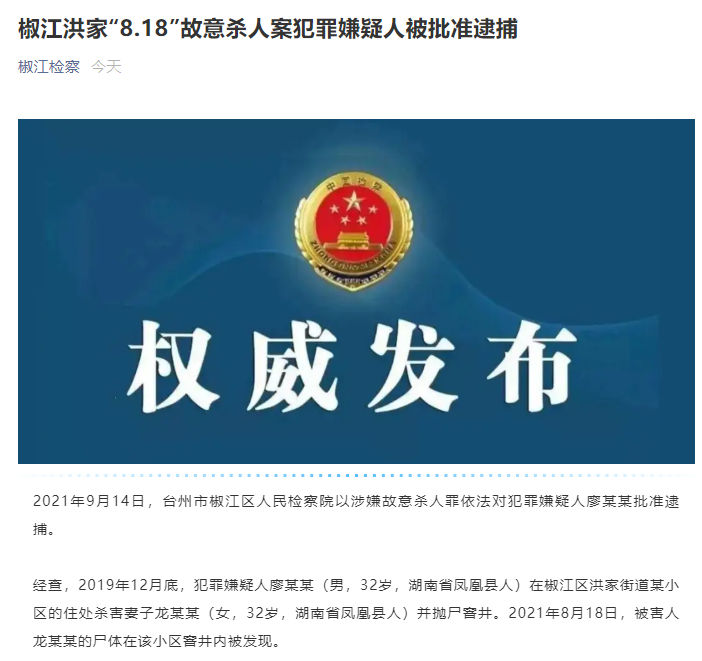 据椒江检察消息,2021年9月14日,台州市椒江区人民检察院以涉嫌故意杀人罪依法对犯罪嫌疑人廖某某批准逮捕。