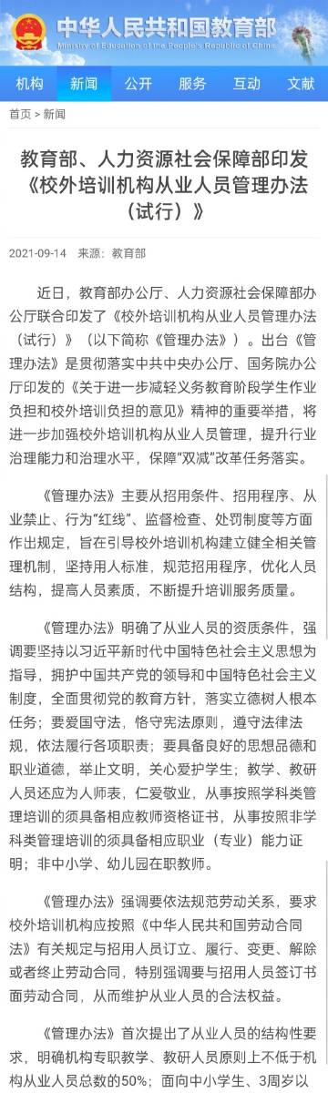#校外培训机构从业人员黑名单管理制度将建立#【两部门印发《校外培训机构从业人员管理办法(试行)》】记者14日从教育部获悉,教育部、人力资源社会保障部日前联合印发《校外培训机构从业人员管理办法(试行)》,将进一步加强校外培训机构从业人员管理,保障“双减”改革任务落实。管理办法明确了从业人员的资质条件,要求不得为中小学、幼儿园在职教师。管理办法首次提出了建设校外培训机构从业人员“黑名单”管理制度,对触碰“歧视、侮辱学生,存在虐待、伤害、体罚或变相体罚未成年人行为”等11类行为“红线”且情节严重的,经查实、审核后,纳入全国统一监管平台的“校外培训机构从业人员黑名单”进行管理。(记者余俊杰)