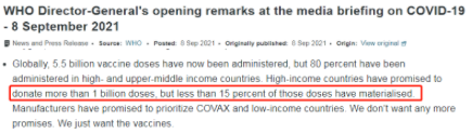 世界卫生组织总干事谭德塞日前再次提醒,全球已接种的55亿剂疫苗中有80%集中在了高收入和中等偏上收入国家。高收入国家曾经承诺分享超过10亿剂疫苗,但目前只兑现了不到15%。“我们不想要更多承诺,我们只想要疫苗”。